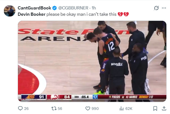 随后布克的右脚无法负重,他在工作人员的搀扶下一瘸一拐的进入更衣室。